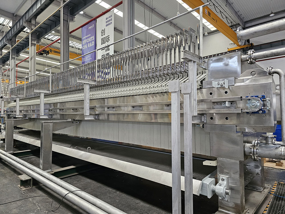 Конструкционные элементы фильтр-пресса полностью покрыты нержавеющей сталью AISI 304 для соответствия санитарным и гигиеническим нормам пищевого производства.