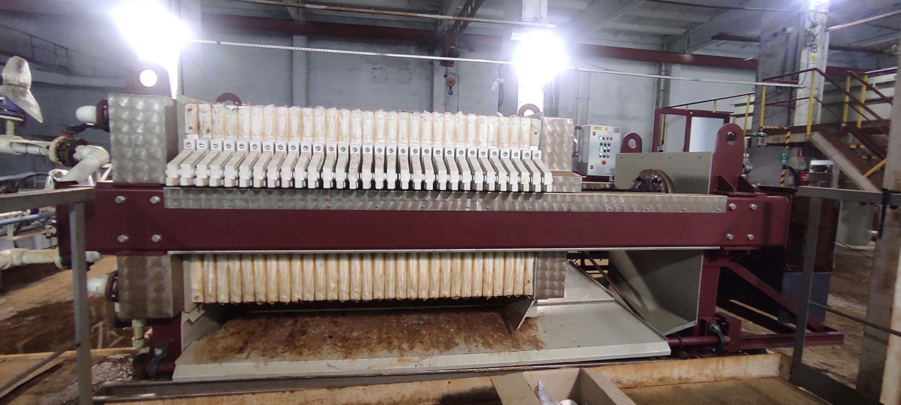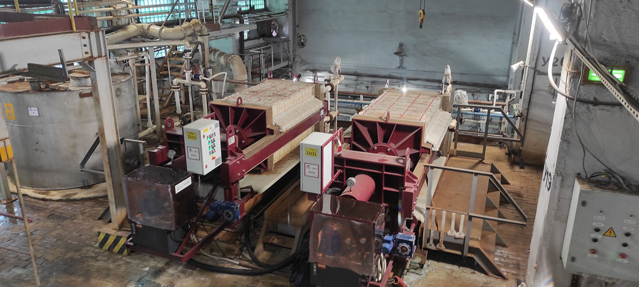 Мы поставили два камерных фильтр-прессов с площадью фильтрации 50м2 каждый для нейтрализации раствора реэкстракции примесей в пульпе.