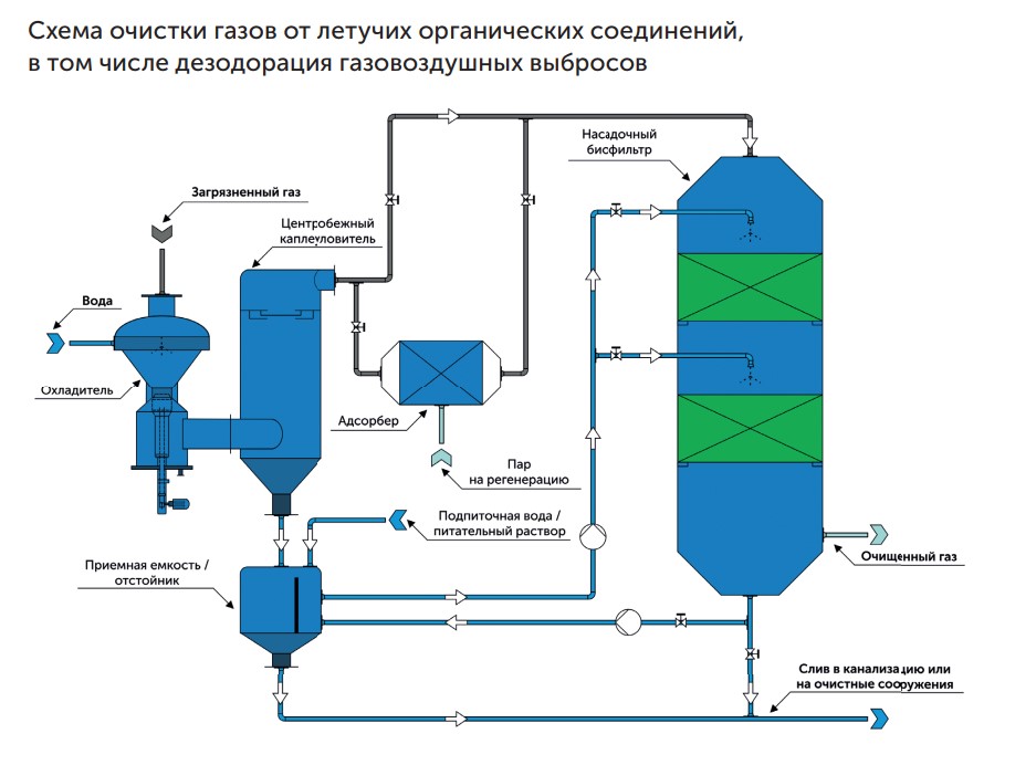 С течением времени происходит регенерация адсорбента паром или газом, который направляется на очистку в биофильтр.