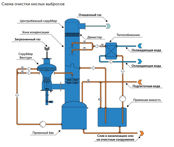 Очистка кислых выбросов, например, после процесса электролиза, состоит из трех стадий. На первой стадии происходит контакт газовой фазы с орошающей жидкостью в скруббере Вентури, где происходит образование капель с поглощением твердых частиц и газообразных соединений.