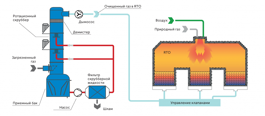 2. Полностью очищенный от аэрозоля газ поступает на систему регенеративного термического окислителя (RTO), где происходит окисление органических соединений с выделением тепла, которое накапливается в керамической среде и служит вторичным источником тепла для новых порций газа, снижая тем самым потребление природного газа.