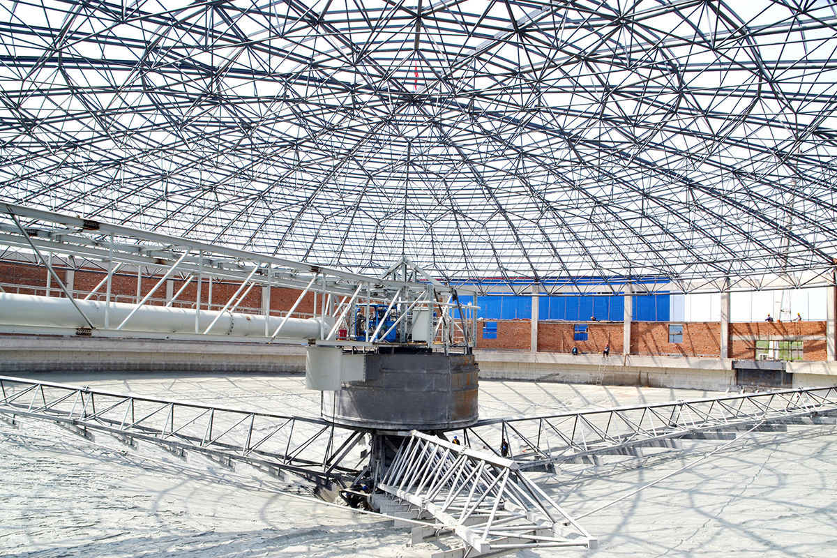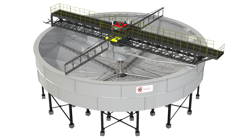 Сгуститель состоит из чана круглого сечения с опорной конструкцией, моста с центральным приводом, питающего колодца, системы граблин, системы дозирования флокулянта, системы пеноулавливания, насосов отведения сгущеного продукта. Для наружного размещения сгуститель также оснащается полноразмерной крышкой, термической изоляцией, отапливаемым помещением над центральным приводым механизмом.