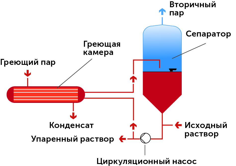 Раствор непрерывно циркулирует через греющую камеру с постоянной скоростью при помощи специального насоса. Повышение скорости циркуляции обеспечивают более высокие параметры теплообмена и препятствуют образованию отложений в трубах греющей камеры. Греющие камеры могут располагаться как соосно с сепаратором, так и вынесено в виде теплообменника.